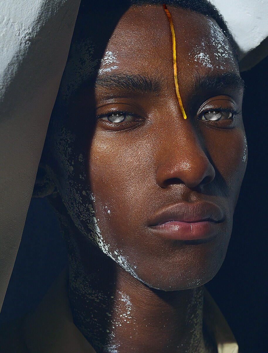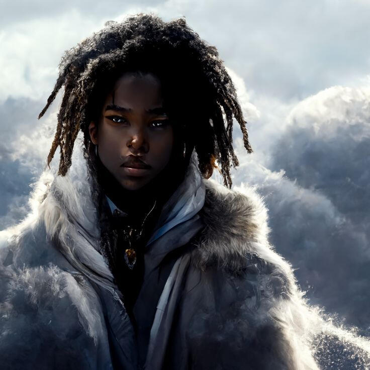 Naturally his black hair is napped up into long dreads that fold downward across his face and the rest tied back into a long ponytail. The sides of his head are shaven.Markings:
