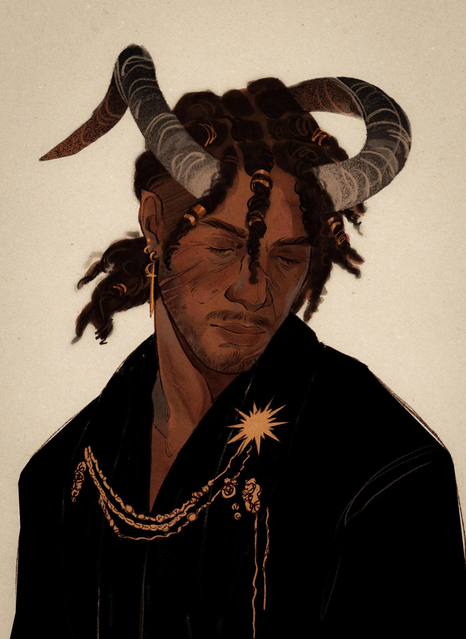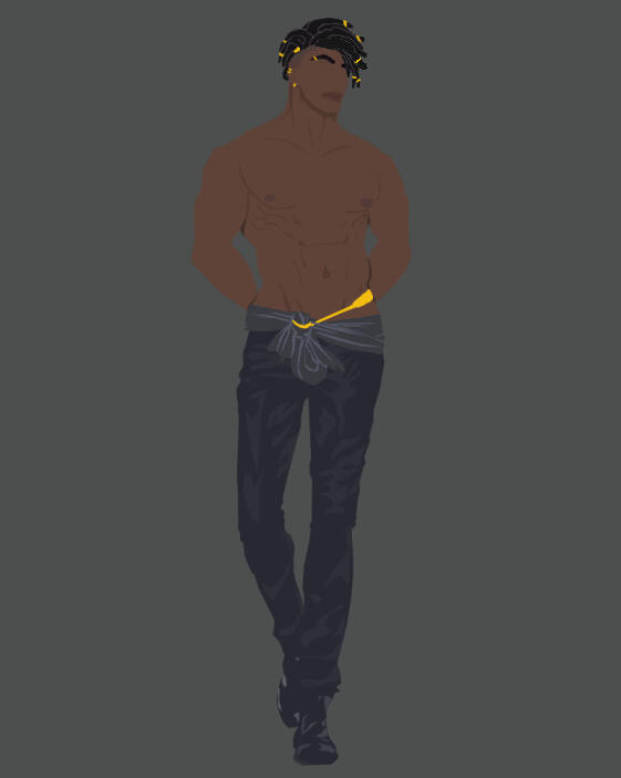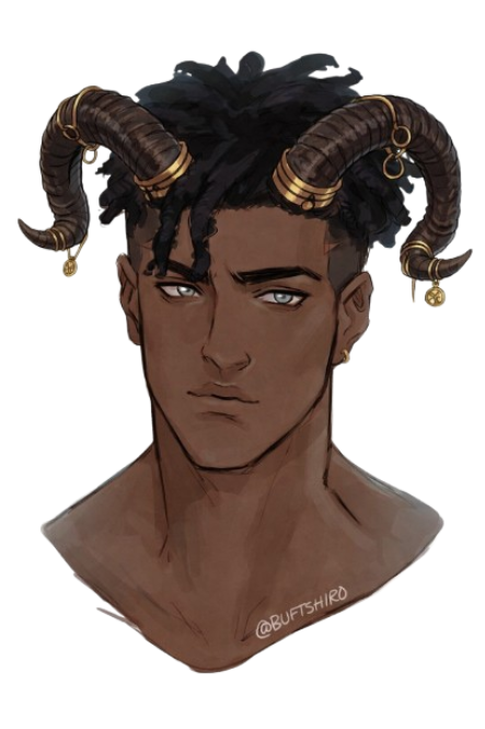 Khari has a small a triangular face with slightly defined cheek bones. In between them, Khari holds a round, button-like nose. Parts of his forehead would be covered slightly by his hair while the backside is covered by his horns.Khari also usually wears a bit facial hair he calls a goatee.Hair:
